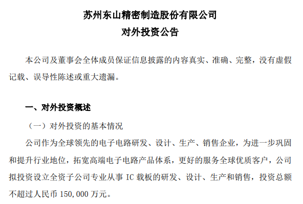 7月28日,A股上市公司蘇州東山精密制造股份有限公司(以下簡稱“東山精密”)發(fā)布公告,擬投資設(shè)立全資子公司專業(yè)從事IC載板的研發(fā)、設(shè)計、生產(chǎn)和銷售,投資總額不超過人民幣15.00億元。