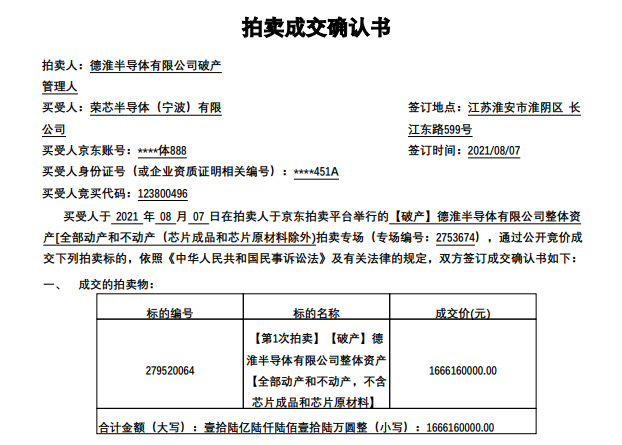 拍賣成交確認書顯示,買受人榮芯半導體人于2021年8月7日在拍賣人于京東拍賣平臺舉行的【破產】德淮半導體有限公司整體資產[全部動產和不動產(芯片成品和芯片原材料除外)],拍賣專場(專場編號:2753674),通過公開競價成交拍賣標的,成交價為16.66億元。