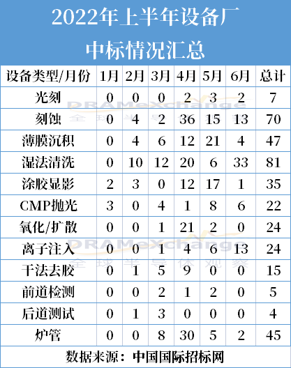 而結合中標數據看,2022 年上半年國內主要設備廠共中標379臺工藝設備,濕法清洗設備81臺,數量排名第一,中標較多廠商為北方華創、中微公司、拓荊科技、芯源微、盛美上海等。