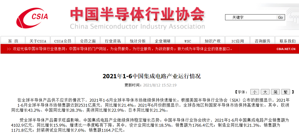 8月13日,中國半導(dǎo)體行業(yè)協(xié)會官網(wǎng)發(fā)布了2021年1-6月中國集成電路產(chǎn)業(yè)的運(yùn)行情況。