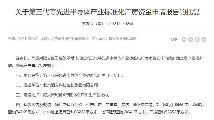近日,北京市發改委官網顯示,北京市發改委已批復順義區第三代等先進半導體產業標準化廠房資金申請報告。