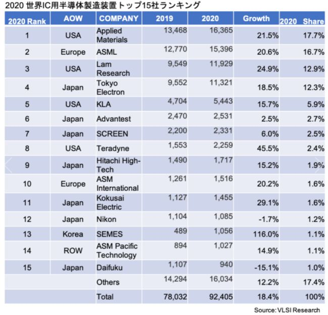材料方面,以硅片為例,2019 年全球大硅片市場中前五大廠商均位于晶圓廠集聚區域歐美、日韓及中國臺灣,其總體市場占有率高達92%。設備方面,根據VLSI公布的2020年全球半導體設備廠商Top 15排名,有14家都來自歐美和日韓地區。