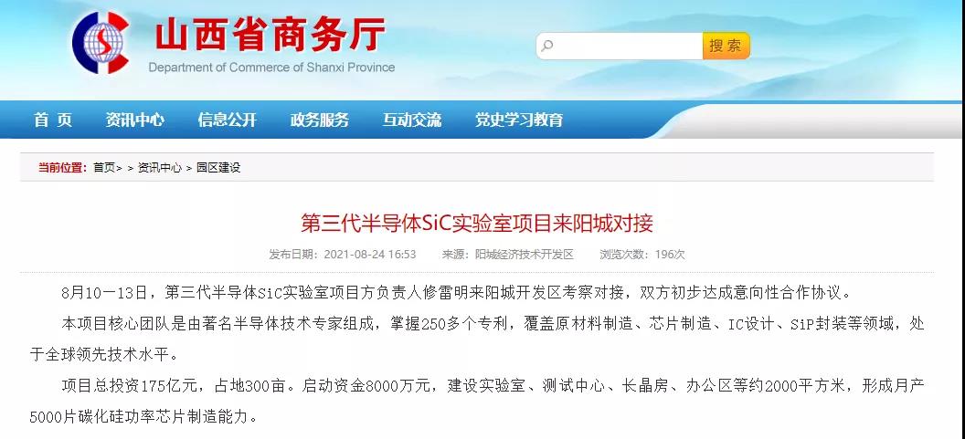 近日,山西省商務(wù)廳發(fā)文指出,第三代半導(dǎo)體SiC實(shí)驗(yàn)室項(xiàng)目方負(fù)責(zé)人修雷明與陽城開發(fā)區(qū)初步達(dá)成了意向性合作協(xié)議。