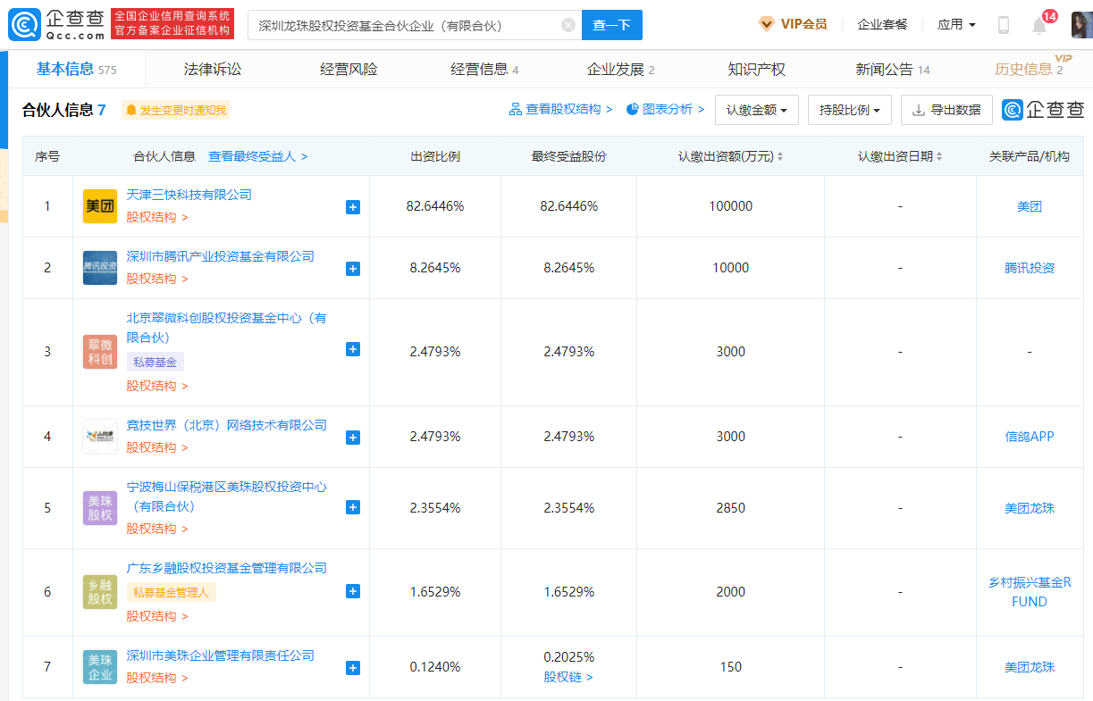 值得注意的是,合伙人信息顯示,深圳龍珠投資的合伙人包括美團(tuán)關(guān)聯(lián)公司天津三快科技有限公司(以下簡(jiǎn)稱“天津三快科技”)、深圳市騰訊產(chǎn)業(yè)投資基金有限公司等,其中天津三快科技持股比例超82.65%。另外,北京酷訊科技由西瓜有限公司持股100%,而后者100%持股深圳美團(tuán)科技有限公司等。